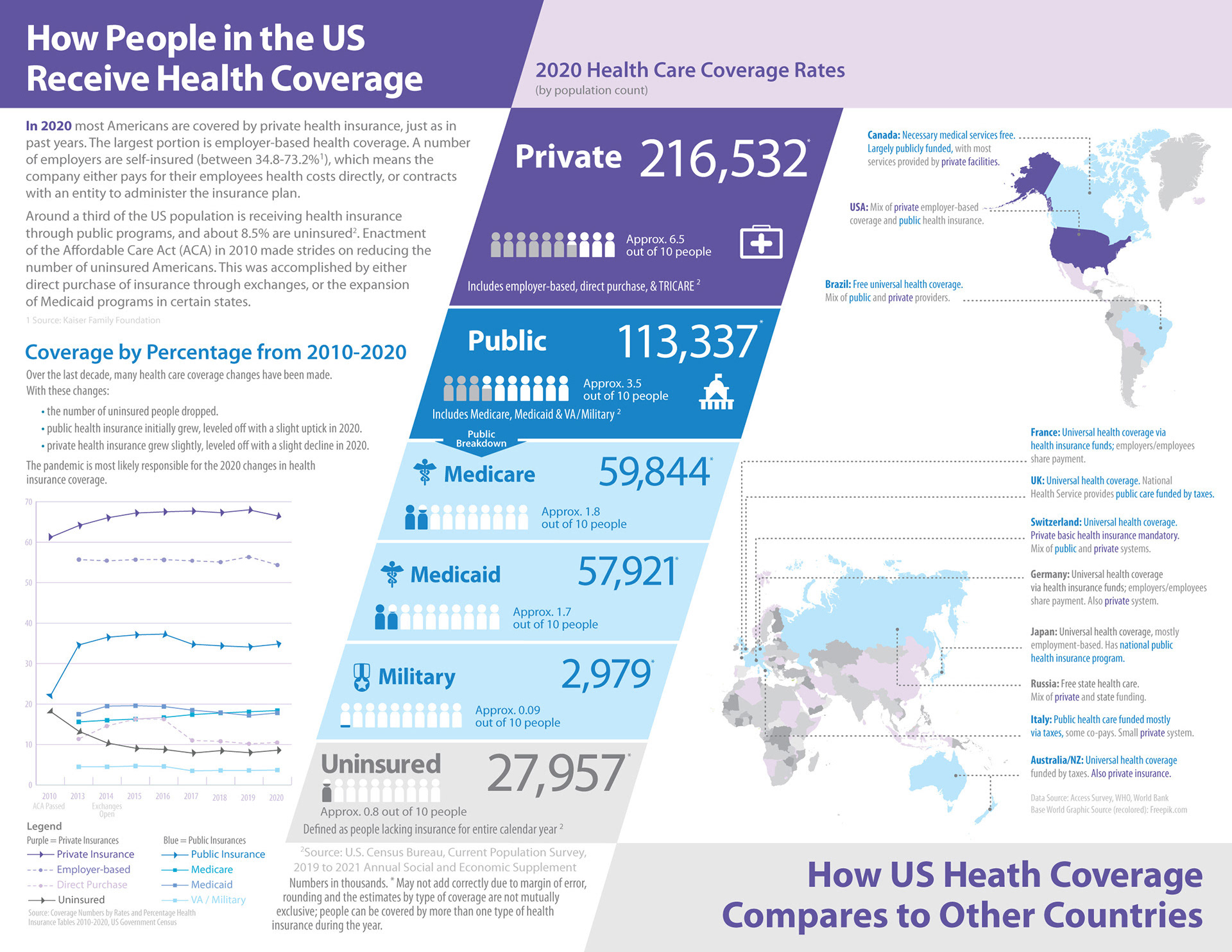Design: This infographic uses color to highlight the main types of coverage, private, public and uninsured. An analogous color scheme was chosen to relate the coverage types as well as keep the infographic easier to view. The deep purple for private coverage is used behind the main headline, as well as the USA in the map to reference that the majority of Americans receive coverage via private carriers. Blue is used for the public coverage to relate to the governments use of that color for its programs. Shades of purple and blue are used to distinguish subcategories within the main groups. The colors are used in the maps as well to add another layer of color coding by type based on a country's health coverage. The people icons demonstrate the population numbers in visual terms that are easier to understand.